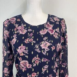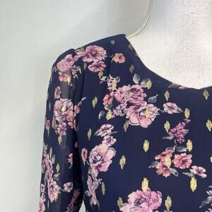City Studio Dress size Small Navy Blue Pink Gold Floral Sheer Ruffles Wedding