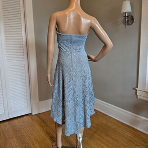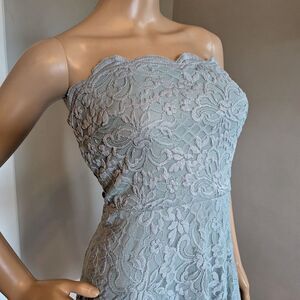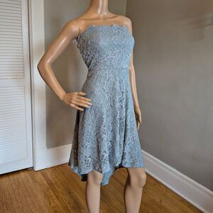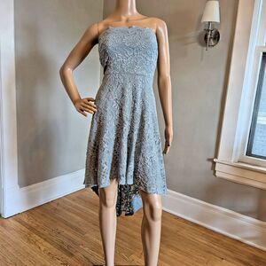 City Studio blue glitter lace hi/low strapless dress. Grippy material inside bodice to hold up dress. Inner hanger straps can be worn as straps for the dress. Zip up back. Dress is VERY sparkly/glittery, it just doesn't show up in photos. Dress is in good preowned condition with light wear including possible loose threads and fraying to lace.