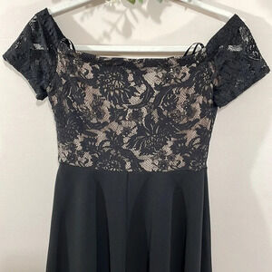 City Studio Off The Shoulder Black Lace Top High Low Dress in size 7. Great preowned condition. Stretch fabric, hidden side zipper, molded cups, top has black lace over nude fabric with same lace detail on bottom hem. Please see photos for approximate measurements and details. Item may show a difference in color based upon photography and perception. Photos are part of the description, as everyone’s level of condition may vary. From smoke free and pet free home. All packages are shipped the same or next business day. Item is pre-owned and may show signs of fading, pilling and/or loose strings from normal wash and wear. I do my best to note and photograph anything that would be a defect such as a hole, rip or stain.
