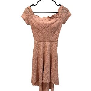 Keywords: City Studio, pink dress, lace dress, high low dress, off shoulder dress, scalloped neckline, size 0, cocktail dress, party dress, formal dress, evening dress, special occasion dress, floral lace, romantic dress, dress