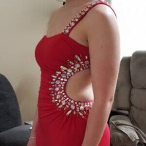 Gorgeous one shoulder dress with gem accented cutout side. Full length, comfortable stretchy fabric