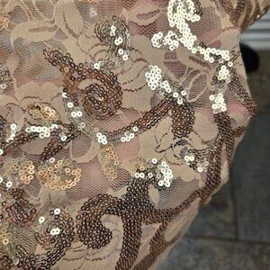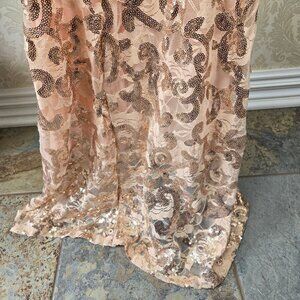 This beautiful gown has a rose gold lace fabric with rose gold sequin accents on the top. Fully lined. Sleeveless. V-neck front with square back. Hidden back zipper. Bodycon with some stretch. A standout dress.