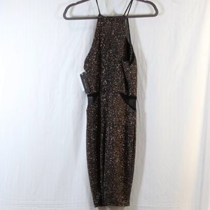 glitter mini dress, sparkle party dress, metallic cocktail dress, halter neckline, body-con silhouette, mesh insert, night out dress, special occasion attire, club wear, prom