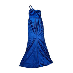 Stunning royal blue evening gown with a glamorous shimmer finish. Features an asymmetrical one-shoulder design. Hidden back zipper closure. Perfect for formal events, proms, galas, or black-tie weddings. The dress showcases a flattering fitted bodice that flows into a flared bottom. Pre-loved in Excellent condition worn once.