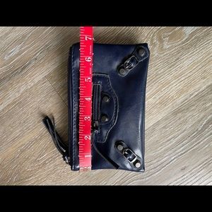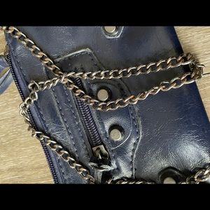 Navy blue pouch with 2 large zip pockets, a middle slip pocket and small zipper compartment on the back. PU faux leather. Used a couple of times, in good condition, a little dusty. All zippers functional.