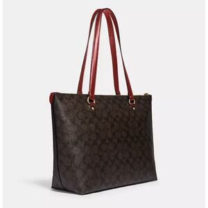 Elevate your everyday carry with the City Tote Bag. Crafted from Coach’s iconic coated canvas, this tote features an all-over signature “C” print in gold and walnut tones, accented with bold red leather trim and straps. The gold-tone hardware adds a sophisticated touch.