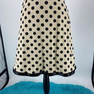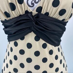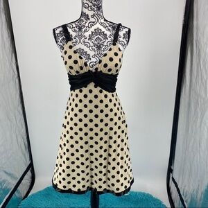 City Triangle brand. Tan and black polka dot dress with decolletage neckline. 1" wide black satin straps. Fully lined with tulle at bottom to add volume to skirt. Pads at bust. Satin at waist. 92% polyester, 8% spandex. Lining 100% polyester. Size medium