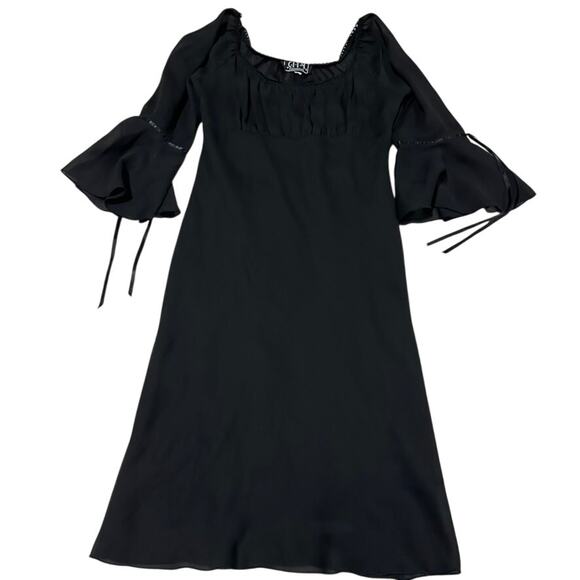 Pretty Black dress with ribboned bell sleeves. Missing size tag, please refer to the measurements below.