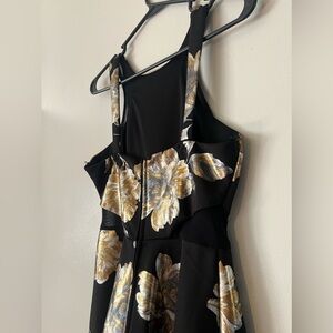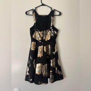 Elegant black dress with gold floral pattern. Sleeveless design. Perfect for special occasions.