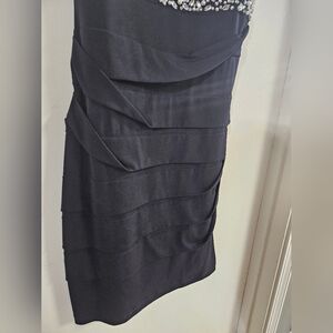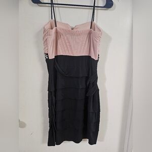 Chic strapless dress with a black body and pink ruched bust. Features a sparkling embellished waistline.