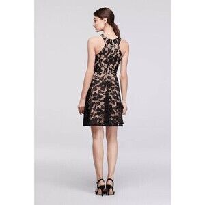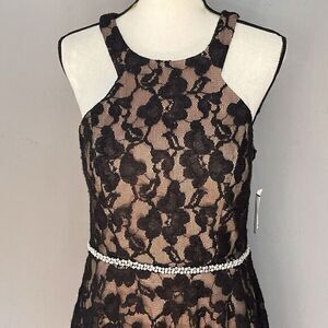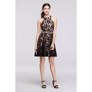 City Triangles/Davids Bridals Short Lace Dress Embellished Waist Black/Nude 12