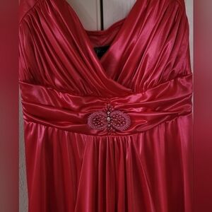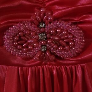 City Triangles Hot Pink Beaded V Neck Dress. Beautiful beaded floral design in the center, shiny Satin like pleated fabric that moves beautifully , and flattering v neck. Has a pink linging for added coverage.