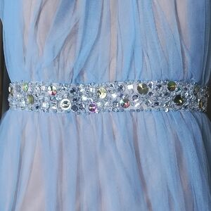 Chic light blue dress with sparkling silver embellishments. Ideal for prom or formal events, it has a small hole in the mesh on the back as shown in the photo barely noticeable.