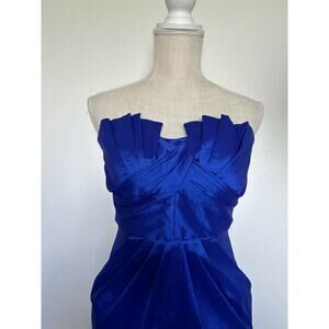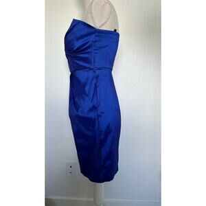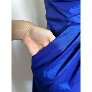This mini cocktail dress has a classic style with an updated design. It comes in a gorgeous metallic cobalt blue. The neckline features a sweetheart neckline that has fan fold pleating to give it added style. The sides have hidden side pockets. It is a mini dress cut so perfect for a cocktail hour or special occasion. The back has a working zipper. The material has a little stretch and it is lined in the bust. In excellent used condition.