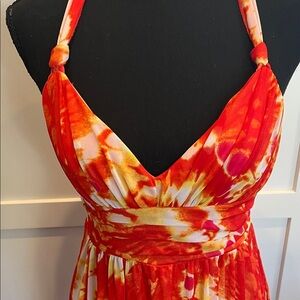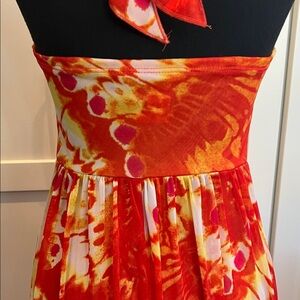 Eye-catching backless dress with halter neckline. Features vibrant red and orange pattern. Ideal for summer events.