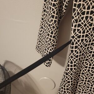 This elegant wrap dress features a stylish black and cream geometric pattern. Perfect for any occasion, it offers a flattering fit and sophisticated look.