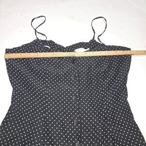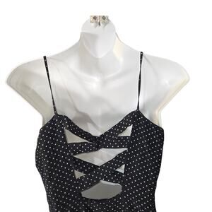 Cute vintage Y2K City Triangles polka dot dress, made in the USA. Features a sweetheart neckline, button-front closure, spaghetti straps, and a flared mini skirt. The back has a super trendy strappy cutout design, very late-90s/early-2000s. Lightweight rayon/acetate blend with great drape.