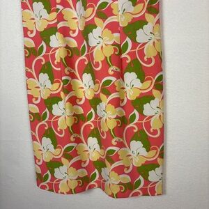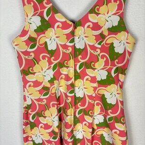 This vintage dress has an empire waist and surplice neckline with bow detail. Vibrant pink, green and yellow floral pattern. Cute short length for summer or spring.