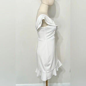 This white crepe ruffled dress can maintain such a cute look for a bachelorette party or for a date night. It is stretchy and form fitting and feminine. It does run smaller but has a cute look to it. It has an off the shoulder dress and has a slip underneath it with lining. It has a hook and eye clasp and zips up in the back. In great condition. Never worn and has no flaws.