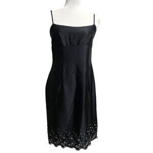 Iconic Y2K-era City Triangles little black dress! This sleeveless slip dress with spaghetti straps and a flattering straight silhouette. The true highlight is the gorgeous sparkly floral embroidery and sequin detail along the scalloped hem. Has a smooth, silk-like feel with a little bit of stretch.