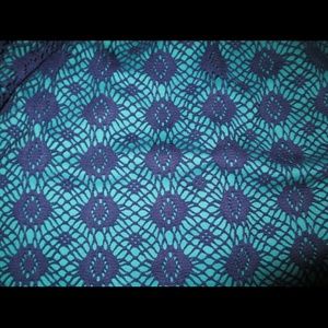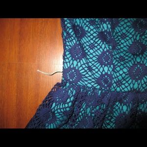 Very cute! The dress is aqua with navy overlap. Can be worn with a belt. The only damage is that the belt loop on one side came unattached which is pictured.