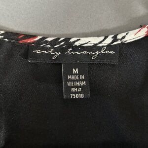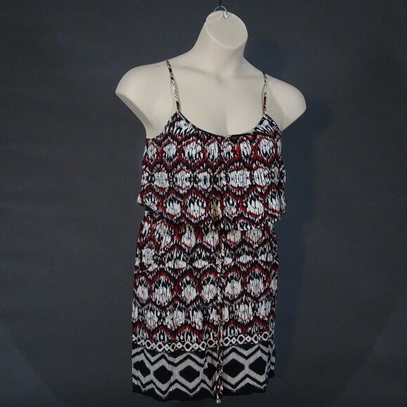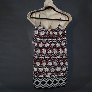 Red, black, and white patterned dress with ruffles from City Triangles, like new, rayon and polyester materials