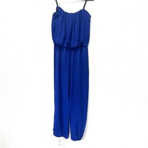 Experience effortless style with this pre-owned City Triangles jumpsuit. It features a sleeveless design and a wide-leg silhouette. The vibrant blue color and flowy fabric provide a relaxed fit, making it perfect for casual outings. With spaghetti straps and an elastic waistline, this jumpsuit ensures both comfort and ease of wear.