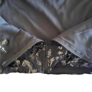 Preowned very good condition very shimmery has back zipper that can completely open up the body is fully lined and sleeves are lacy and see through