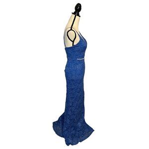 City Vibe Blue Shimmer Glitter Lace High Slit Evening Gown Size 3 Rhinestones