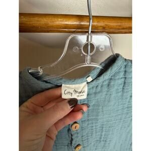 City mouse short-sleeved baby romper in a teal/blue double gauze cotton material with wooden buttons. 100% muslin cotton size 18-24