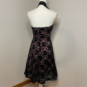 Stylish dress with pink lining and black lace overlay. Ideal for elegant events.