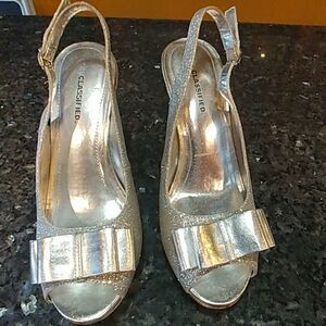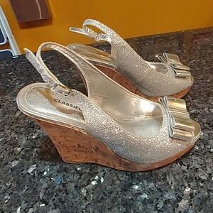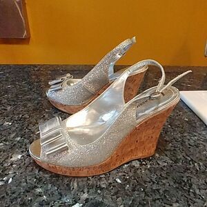 Silver glitter slingback wedge peep-toe pumps with silver bows. A perfect pair with your holiday party dress. Cork wedges, rubber soles, adjustable straps. Sole measures 8" from heel to toe, footbed measures 10" heel to toe. Glitter peeling on right strap.