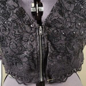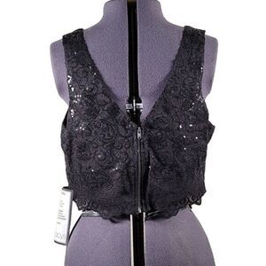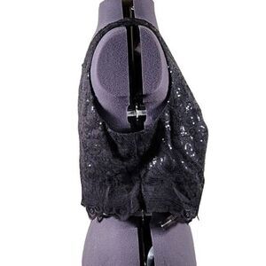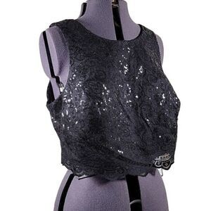 This sequin crop top blouse by City Studio zips up the back and has a short liner with lace trim extending beyond the hem. Content: 100% polyester. Care: dry clean only.