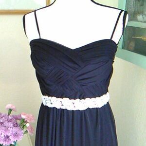 Elegant and simple. YOU are the star of this dress. Woven look at chest. Straps. Supports at side. Front has a strip to secure the top against your skin. Back zip. Fully lined. Underneath chest is a band of beads and jewels. Under chest is a draped skirt in semi- sheer black fabric over a solid black lining. Size 9 measures 32 at chest, 28 under chest. 42 at hips. 59 long from top of strap to hem. So beautiful!