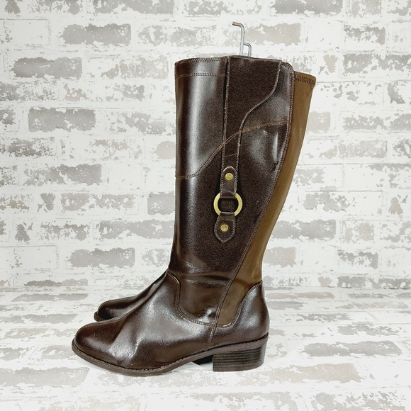 Civic Lila Brown Leather Elastic Calrf Block Heel Side Zip Tall Boots W20