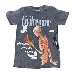 The Civil Regime Acid Wash Men's T-Shirt in size S is a new graphic print shirt with a crew neck and short sleeves. Made of cotton in a gray color, this regular fit shirt is machine washable and features a logo accent. The shirt blends elements of hipster, designer, motorcycle, punk, grunge, skull, and classic themes, making it a versatile addition to any wardrobe. Perfect for casual wear, this 2020-2029 manufactured shirt is a stylish choice for men looking to add a touch of edgy flair to their outfit.