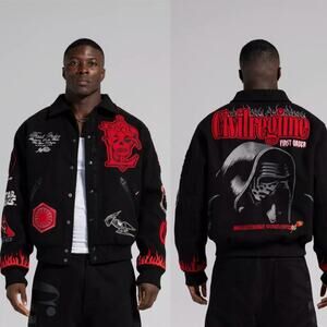Extremely RARE and collectible Kylo Ren varsity jacket from the Civil Regime x Star Wars collab. This premium heavyweight jacket features bold embroidered First Order and Kylo Ren graphics, flame details on the sleeves, and a quilted interior with lightsaber artwork. Made from a soft wool-look 100% polyester, it offers the same structured streetwear vibe without the itch. Perfect for display or wear.