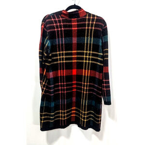 CJ Banks Women's Open-Front Cardigan Sweater is a size PL with a multicolor plaid pattern. It features long sleeves and is designed in a petites size. The sweater is made of a cotton blend knit fabric, with an open-front style.