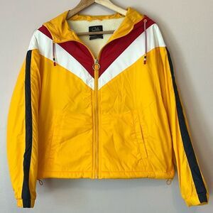 Streetwear, Sherpa, chevron, colorblock, yellow, red, white, indie, fall, winter, spring, casual, relaxed, college, school, campus, zipper, 90s, 80s, retro, vintage inspired, lightweight, water resistant, wind resistant, windbreaker, nwt, new, kidcore, unisex, bright, colorful