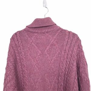 Pinkish purple, 100% pure new wool, chunky cable knit turtleneck sweater.