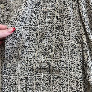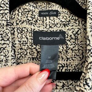 A timeless and sophisticated silk button-down from Claiborne, featuring a neutral black, brown, and white pattern that pairs effortlessly with jeans or dress pants. This luxurious, lightweight shirt is perfect for any occasion, offering a relaxed yet polished look. It also works great as an oversized top for women!