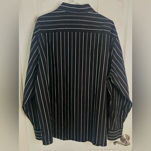 Preloved in Excellent Condition, Worn maybe once! Elevate your wardrobe with this Claiborne Big & Tall Modern Fit button up dress shirt, showcasing a refined black base with sleek white & beige pinstripes. Made from a comfortable cotton blend, it features long sleeves and a classic collar, perfect for work or formal occasions. This shirt embodies timeless elegance and professionalism.