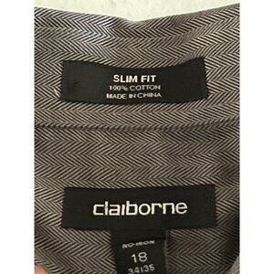Elevate your wardrobe with this Claiborne slim fit dress shirt, designed for the modern man. Its sleek grey hue and elegant design make it an ideal choice for both business meetings and social gatherings. Crafted from 100% cotton, it offers comfort and sophistication in a single package. In great condition.