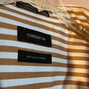 Claiborne men Striped Button-Up wrinkle free Shirt tan light blue work career XL