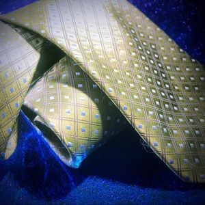 Claiborne all silk neck tie with Garment Guard™️ , anti stain coating . A key-limey yellow green shiny backdrop with double olive green thread diamond lines with textured periwinkle blue diamonds within them . A tasty looking beaut’ ripe for summer . No obvious flaws , lightly loved condition