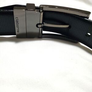 Classic black bonded leather belt with silver colored buckle. Pre-owned in good condition. Please refer to pictures for best description and condition verification. Size 38.