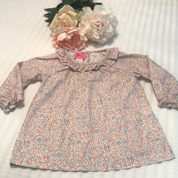 Claire & Charlie floral ruffled top, soft colors of orange, white, and light blue, ruffle neckline with back button closure, long sleeves with ruffle cuffs, 100% soft cotton, in excellent preowned condition, no flaws.