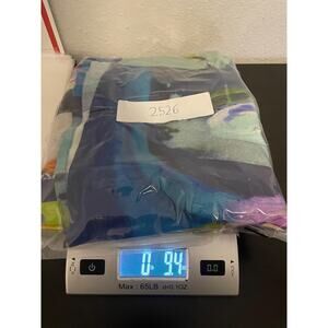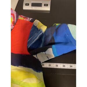 Pattern/Color: Vibrant multicolor abstract art print (blue, green, red, yellow, pink, turquoise)