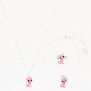 Claires Club Kitten Jewelry Set Necklace Bracelet Ring Silver Tone Pink