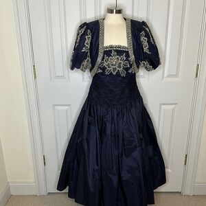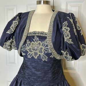 Claires Collection Silk Elegant Navy Blue Crystal Embellished Dress & Bolero Jacket